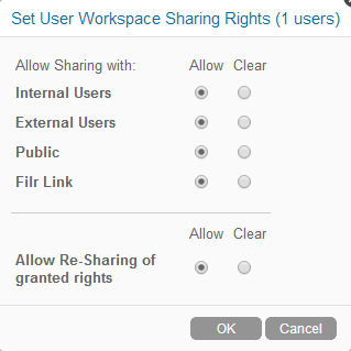 If you have already removed a share right and you want to add it again, select the radio button in the Allow column next to the sharing right that you want to add to the user or group, then click OK.