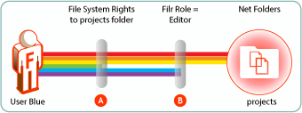 Because User Blue doesn’t have the Erase right, Filr assigns the Editor role. This means that even though Blue has Create (blue) and Modify (purple) rights on the file system, and could exercise them through a file browser, such as Windows Explorer, Blue’s Filr functionality is limited to editing files within the projects folder. |