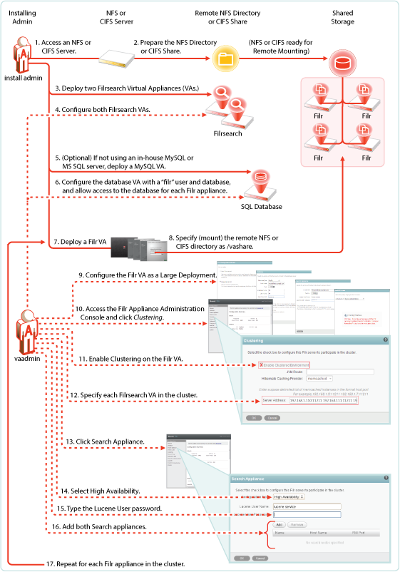 Filr clustering involves two or more Filr VAs sharing the same NFS or CIFS data storage location (/vashare). You can only create a cluster if your Filr appliances were deployed pointing to the same /vashare disk.