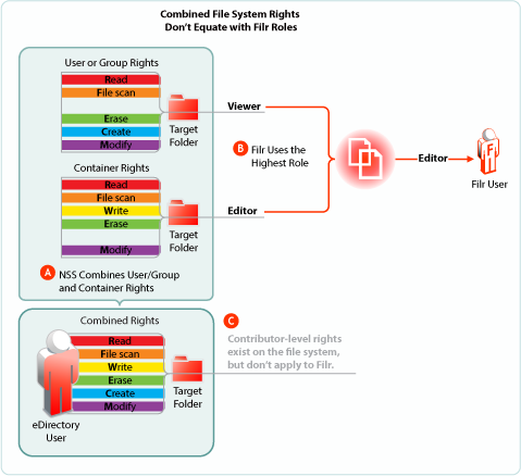 Figure 4-9 illustrates that NSS file system rights are calculated differently than Filr roles on NSS-based Net Folders.