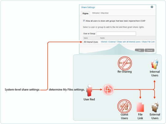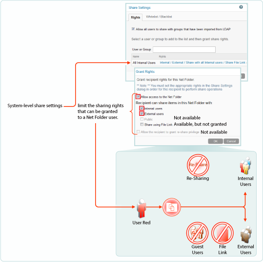 In Figure 12-4, user red can only be assigned sharing rights that are allowed at the system level.