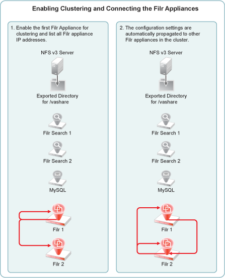 Figure 4-11 illustrates at a high level how the relationships between the Filr and Filr Search appliances are established to create a Filr cluster.