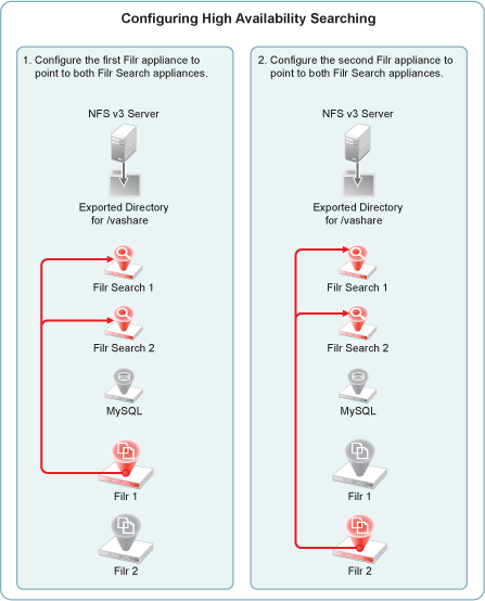 Enable high-availability searching and add both Filr Search appliances to each Filr appliance.