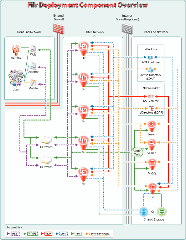 Figure 3-1 illustrates the components and protocols that could be included in a large, expandable Filr deployment. As you access the sections that follow, similar illustrations show which components are impacted by the planning recommendations in that section.