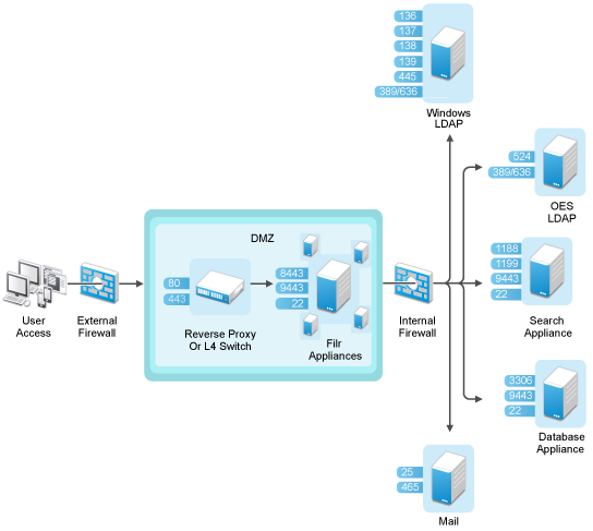 The following graphic illustrates a basic setup with Filr running in a DMZ, including information about the ports that you need to open for the firewalls and for communication between the various servers: