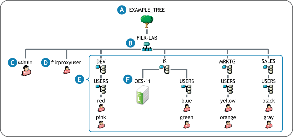 FILR-LAB contains four Organizational Unit (OU) container objects (DEV, IS, MRKTG, and SALES), each representing a department within the organization. Each of these in turn has a USERS OU container. |