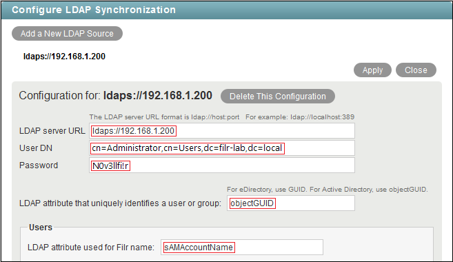 IMPORTANT:This is the distinguished name of an Active Directory user who has sufficient rights to access the information for the test users that you created in Section 4.0, Creating Test Users. For example, it could be the user name that you used for that task. HINT:If you aren’t certain of the syntax, open a terminal prompt on the server and enter the dsquery user command. For example, the DN for the Administrator user account used to create the test users when developing this guide is: cn=Administrator,cn=users,dc=filr-lab,dc=local. |