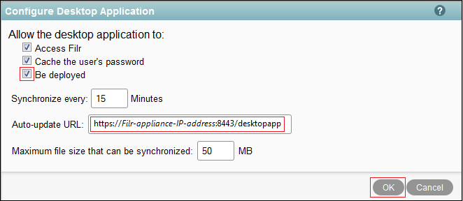 In the field, type https://Filr-appliance-IP-address:8443/desktopapp/, then click .