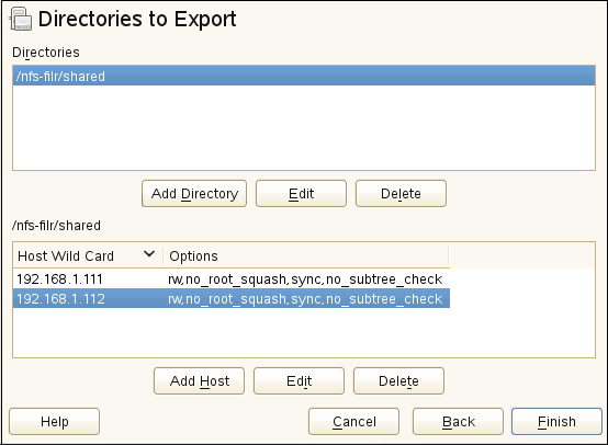 If you need to secure NFS server access, then as you specify the export options for the exported directory, ensure that you create a entry for each Filr appliance that needs access, as shown.