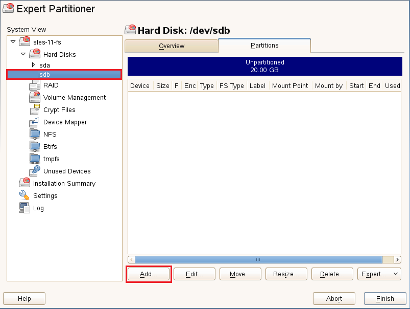 The example SLES 11 NFS server has only a single 20 GB hard drive. We could create a directory on that drive and export it. However, the Filr-clustered appliances need enough disk space for all of the Filr users’ personal storage as well as HTML renderings and text extractions. Obviously, the amount of disk space needed is probably much larger than the free space that exists on the example SLES 11 server.