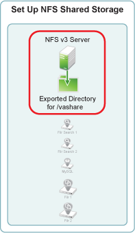 The first task in setting up a Filr cluster is to make sure that you have NFS shared storage available for the Filr appliances to use for their /vashare mount points. Figure 5-2 is the first in a series of illustrations that depict the order in which components are deployed and configured to form a Filr cluster.