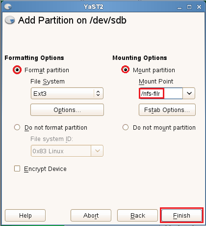 Format the partition, and specify its mount point as /nfs-filr, then click > > .