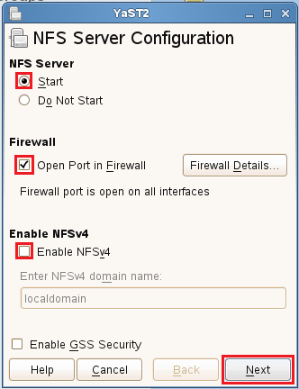 Set the server to start, open the firewall port, and disable (deselect) NFS v4 support.