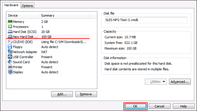 Although the example below shows a 100 GB disk being added, this is not a best practices recommendation. Be sure to follow the planning guidelines in Filr Appliance Storage