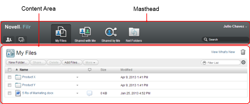 Search Field: A global search that searches all content within the Filr site, including file metadata and content within files.