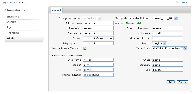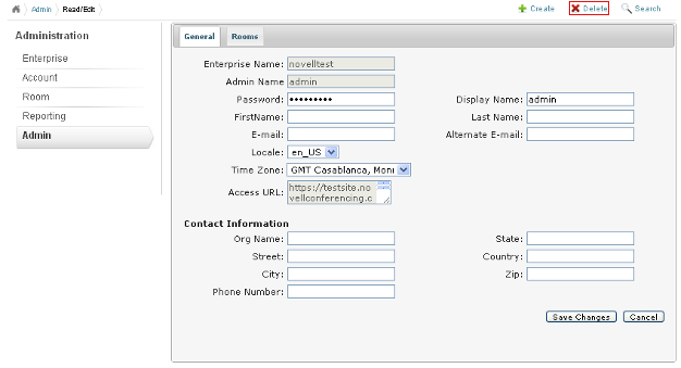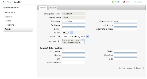 Options in the tab allow you to edit or update contact information, the display name, first and last names, e-mail address, time zone, language, and password for an admin user account that exists on the Novell Conferencing server.