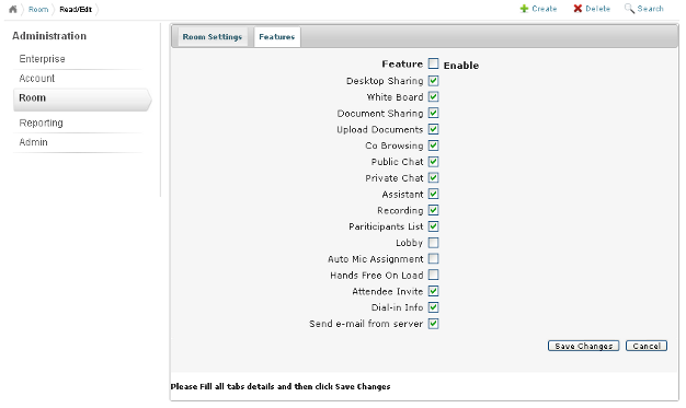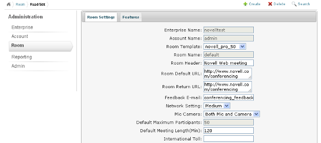 You can edit the room header text, default URL, return URL, feedback e-mail address, network setting, microphone and camera type, meeting length in minutes, and several other properties that are used when the associated admin user conducts a Web meeting.