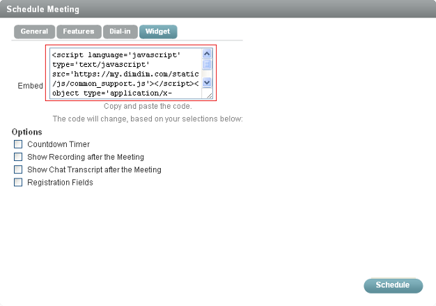 A Conferencing user can copy the code for the widget and post it in another location. The code is available when you schedule a meeting or when you edit a meeting.