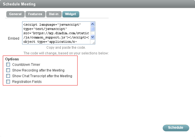 If you have selected the option in the tab of the Schedule Meeting dialog box, no one can register or join by widget after the countdown timer starts.