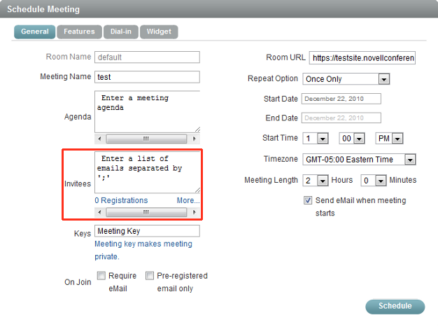 Every time a Novell Conferencing meeting is scheduled, a small control called a widget is automatically created. The meeting host can share the widget on any Web site and anyone can use it to register for an event just by specifying his or her e-mail address. For more information, see Section 5.0, Using the Widget.