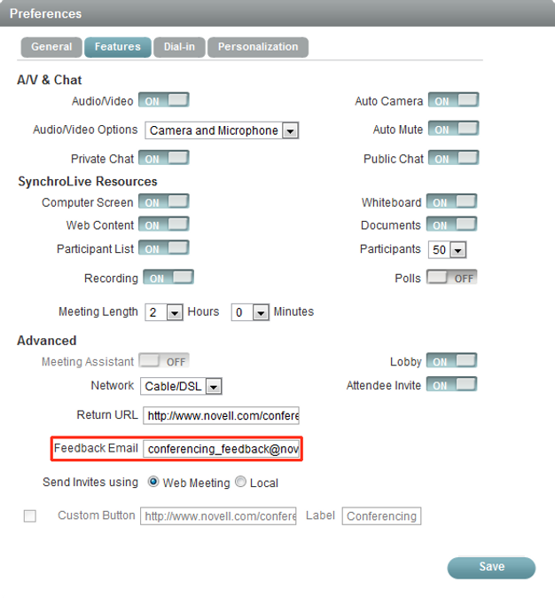 On the Features page, in the field under the section, specify the e-mail address where you want the feedback for the meeting to be delivered.