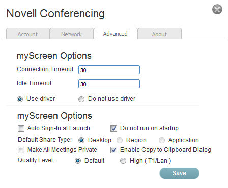 Use Driver: Enables or disables the driver used to capture your computer screen. Do not turn this option off unless you are told to do so by Novell Conferencing support.