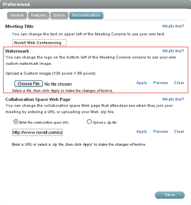 As a user, you can replace the Novell Conferencing logo on the dashboard with your company or organization logo. The image must be 138 pixels by 58 pixels.