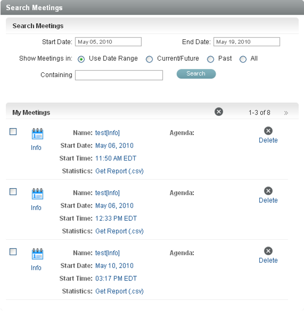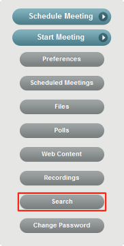 The Search option lets the host look for information about previous meetings, including registrants, chat transcripts, or recordings. You can choose to search by start date, end date, current/future date, past date, all dates, and by text. You can also use this option to find a list of attendees.