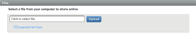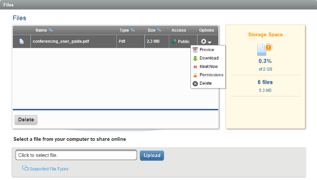 The option allows you to upload files into your meeting room, then share the files during your meetings. You can upload PowerPoint presentations, Adobe PDF files, Microsoft Word documents, and Microsoft Excel spreadsheets. Conferencing allows you to store up to 2 GB of files, polls, Web content, and recordings.