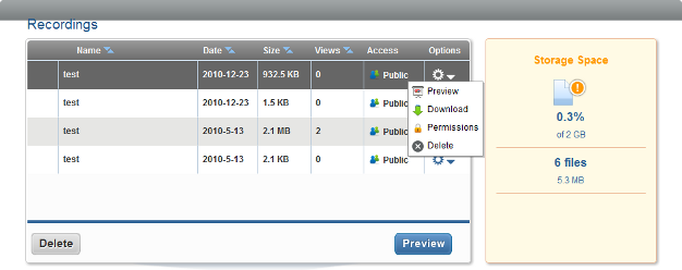 The Recordings option lets you manage all of your saved recordings. You can preview, download, set permissions, and delete your saved recordings. The recordings share the same storage space as files, polls, and Web content. For more information about recordings, see Section 6.2.3, Using the Recordings Option.