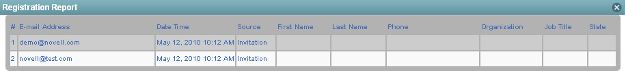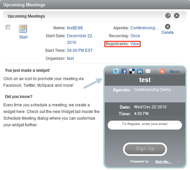 Before a meeting begins, the host can view a registration report listing individuals who have received an invitation to the meeting and individuals who have used the widget to register for the meeting.