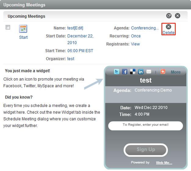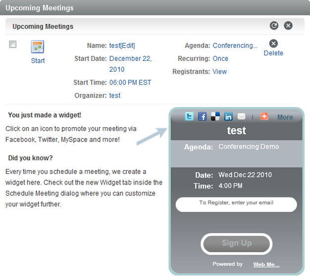 A widget is also created, which you can use to invite people to your meeting and to track meeting details. For more information, see Section 5.1, Viewing the Widget.
