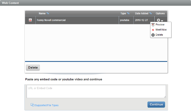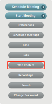 Web Content allows you to share real-time media with your attendees during a meeting. You can enter the URL for YouTube Videos or Google Picasa Web Albums, or the embed code from video content hosted on any site, and share it when you are inside a meeting. Conferencing allows you to store up to 2 GB of files, polls, Web content, and recordings.