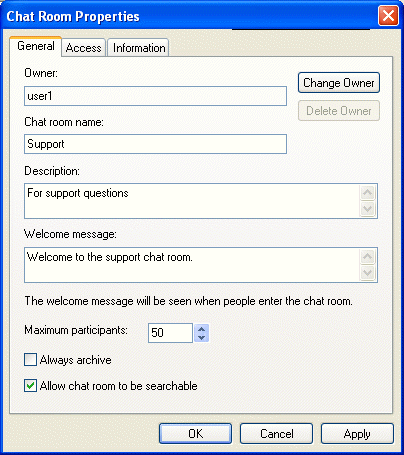 There are two ways to create a chat room: in the client interface and in ConsoleOne.