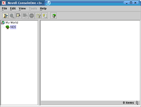 The required SSL connection is most easily configured in ConsoleOne. On Linux, ConsoleOne does not automatically authenticate to any eDirectory trees when it starts, so the NDS object is not immediately expandable.