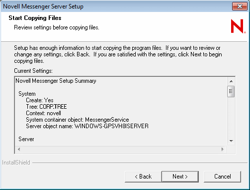 If you are running the Messenger Installation program at a Windows workstation or server, ensure that you are logged in as an Admin equivalent to the eDirectory tree where you are planning to create your Messenger system. If you are installing the Messaging agents on a Windows server, you should run the Installation program at that server.