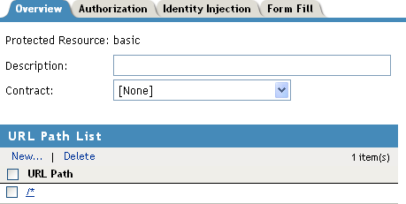 A protected resource configuration specifies the directory (or directories) on the Web server that you want to protect. The protected resource configuration specifies the authorization contract and the policies that should be used to enforce protection. The authentication contract and the policies (Authorization, Identity Injection, and Form Fill) enable the single sign-on environment for the user. The type of protections a resource requires depends upon the resource, the Web server, and the conditions you define for the resource.
