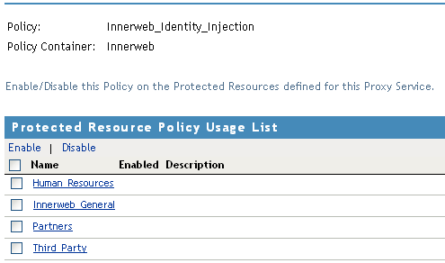 Only the policies that are enabled are applied to this resource. All available Identity Injection policies are listed. If you use the same policy for multiple protected resources, use the policy description field to indicate this.