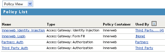 To edit an existing policy, click the name of the policy. Remember that policies can be assigned to multiple protected resources. If you modify the policy, you are also affecting how this policy protects those resources. For configuration information, see Section 28.2, Creating Access Gateway Authorization Policies.