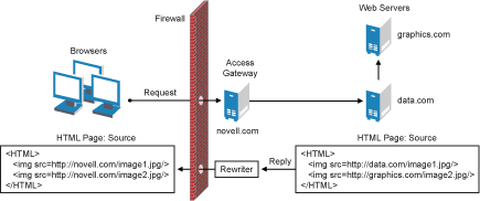 The page on the data.com Web server contains two links, one to an image on the data.com server and one to an image on the graphics.com server. The link to the data.com server is automatically rewritten to novell.com, when rewriting is enabled. The link to the image on graphics.com is not rewritten, until you add this URL to the . When the link is rewritten, the browser knows how to request it, and the Access Gateway knows how to resolve it.