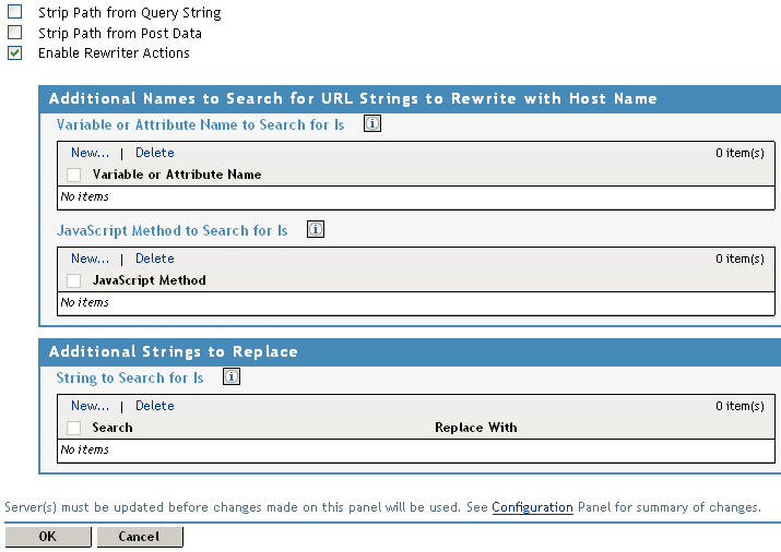 To make sure all the paths generated by JavaScript are rewritten, you must search the Web pages of the application. You can then either list all the JavaScript methods, parameters, and variables in the section of the rewriter profile, or you can use the $path token in the section. This token, which is a shortcut for the multi-homing path, together with the and actions, usually can find all the paths that need to rewritten. If nothing else, it reduces the number of JavaScript methods, parameters, and variables that you otherwise need to list individually.