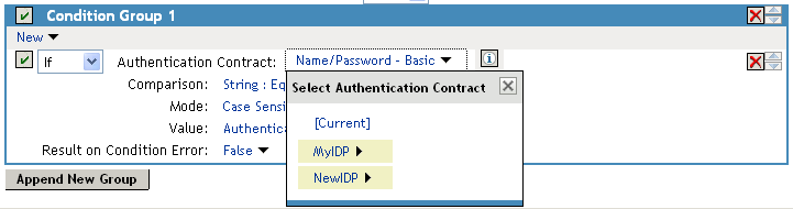 Authentication Contract: To compare the contract that the user used with a static value, select . To compare a static value with what the user used, select a contract from the list.