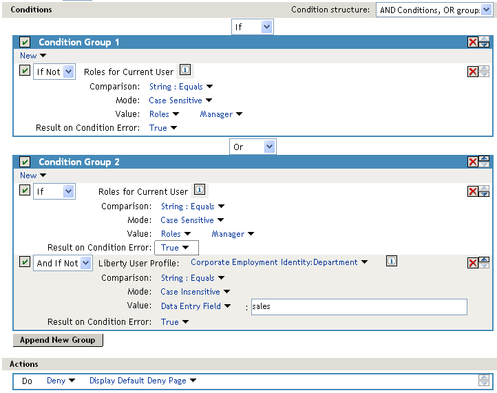 The second condition group matches the users who are managers but don’t belong to the sales department. Because they match both conditions, the Deny action is applied. For these two condition groups to work with this logic, the is set to .