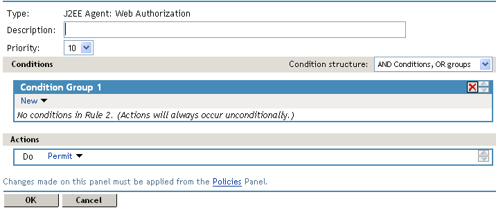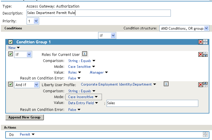The conditions in Rule 1 are ANDed, which requires the user to match both conditions before they are granted access to the resource. The priority is set to 1, so this rule is the first rule that the Access Gateway processes. The J2EE authorization policies use the same logic.