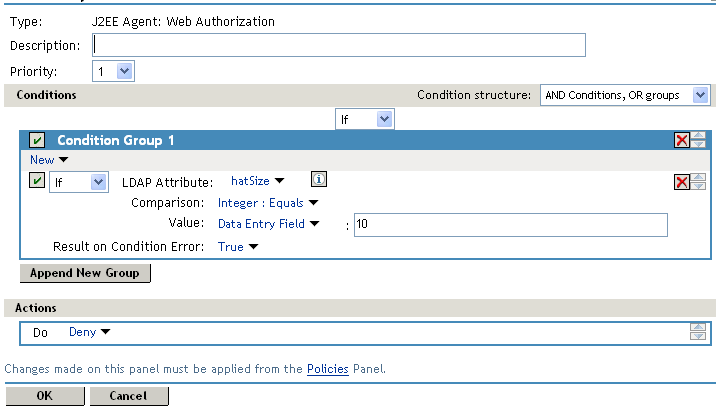 For example, suppose one of the Deny rules uses an LDAP attribute for the condition and that the attribute is a hatSize attribute. Some of your users do not have a hatSize attribute, so when they access the resource, the comparison generates an error. If option is set to False, the action (Deny) is not applied, and the next rule in the policy is processed. If that rule is the general Permit rule, then they are allowed access to the resource because they experienced an error. To prevent this behavior, you need to set the option to True, so that the Deny action is applied. Your rule then denies access to everyone whose hatSize attribute matches the specified value and everyone who does not have the attribute.
