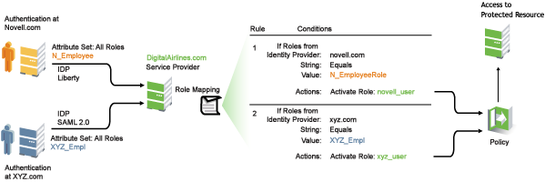In this example, employees authenticate to identity providers novell.com (Liberty) or xyz.com (SAML 2.0). Each user is assigned to a role (such as N_EmployeeRole or XYZ_Empl, respectively). Attribute sets at each of the identity providers are configured to exchange the attribute with the trusted service provider, DigitalAirlines.com. DigitalAirlines.com consumes the authentication assertions, then maps the incoming roles to local roles. The mapped roles at DigitalAirlines.com can be used as evaluated conditions in authorization or J2EE policies, which can provide access to resources intended for the authenticated employees.