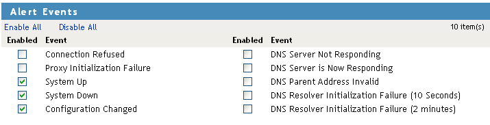 The Access Gateway has been programmed to issue events to various types of systems (such as a Novell® Audit server or a Syslog server) so that the administrator can be informed when significant changes occur that modify how the Access Gateway is performing. For information about auditing and audit events, see Section 31.0, Enabling Auditing. This section describes how to use the following types of alerts: