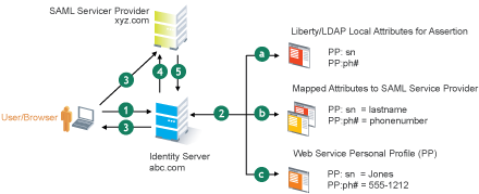 Because the identity provider must interoperate with other SAML service providers that probably do not use consistent attribute names, you can map the service provider attributes to your Liberty and LDAP attributes on the Identity Server. In this example, the service provider names for the Liberty PP:sn and PP:ph# attributes are lastname and phonenumber, respectively. (See Section 9.8, Selecting Attributes for a Trusted Provider.)