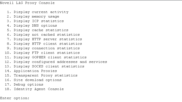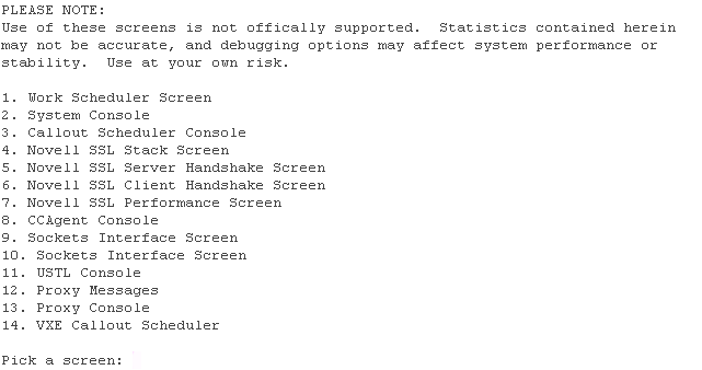 Most of the time, the Proxy Console screen is the one you should pick. The other screens are used mainly by the developers of the Linux Access Gateway. If you are having SSL connection problems, the SSL screens can help in diagnosing the problem.