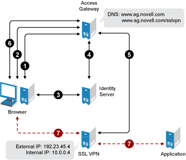 The following figure shows the Novell Access Manager components and the process involved in establishing a secure connection between a client machine and an SSL VPN server: